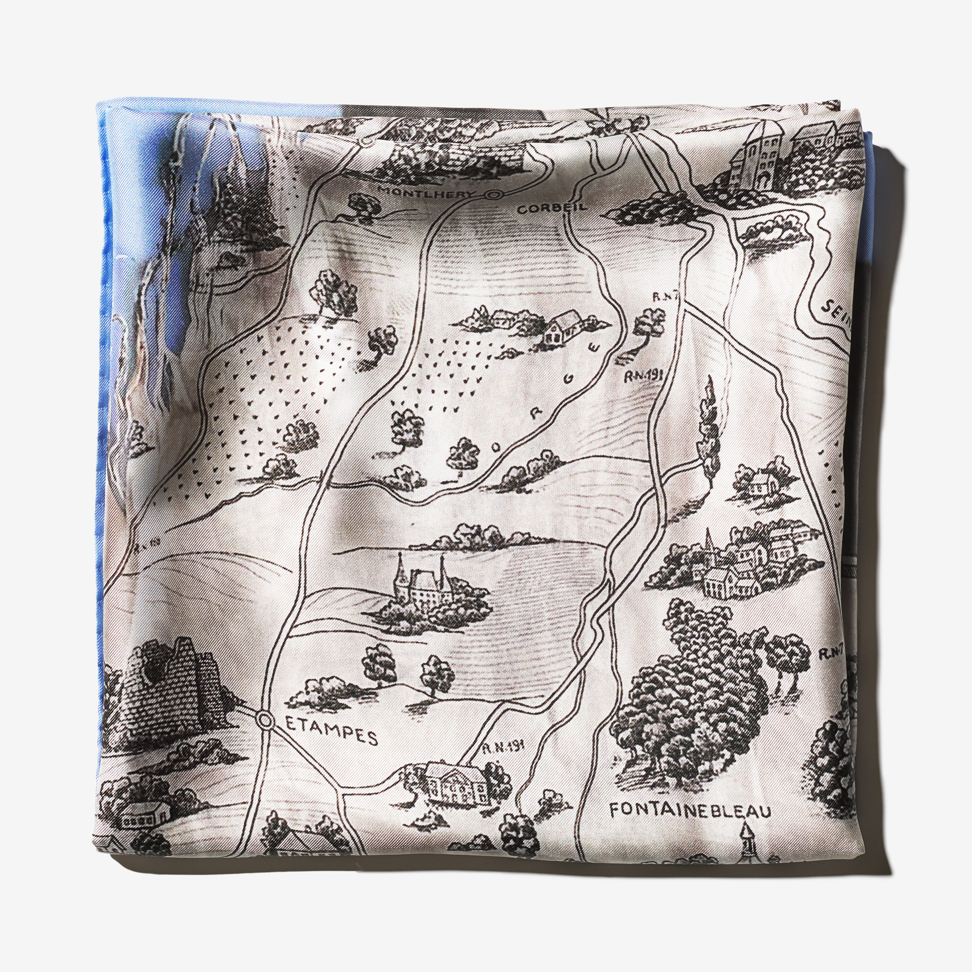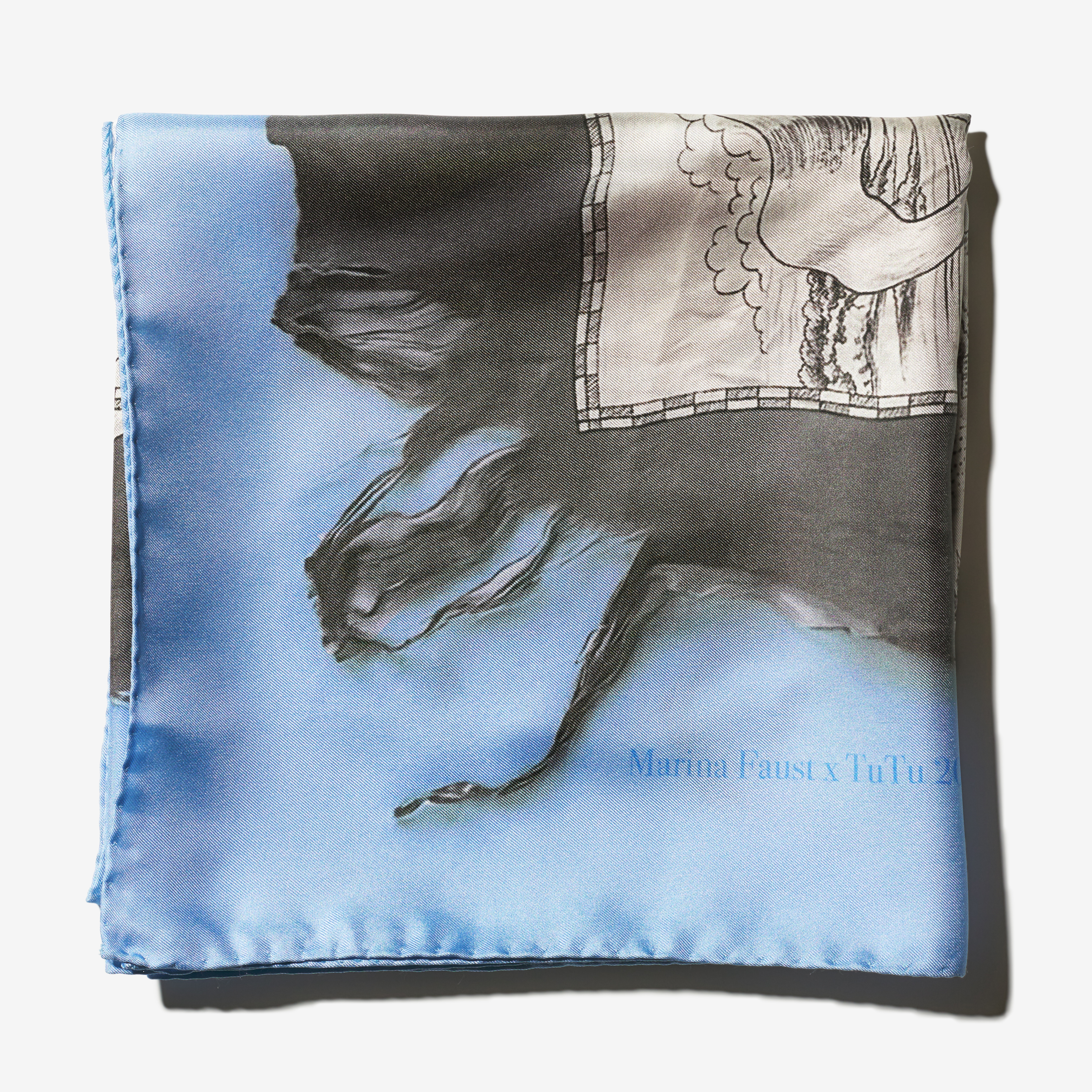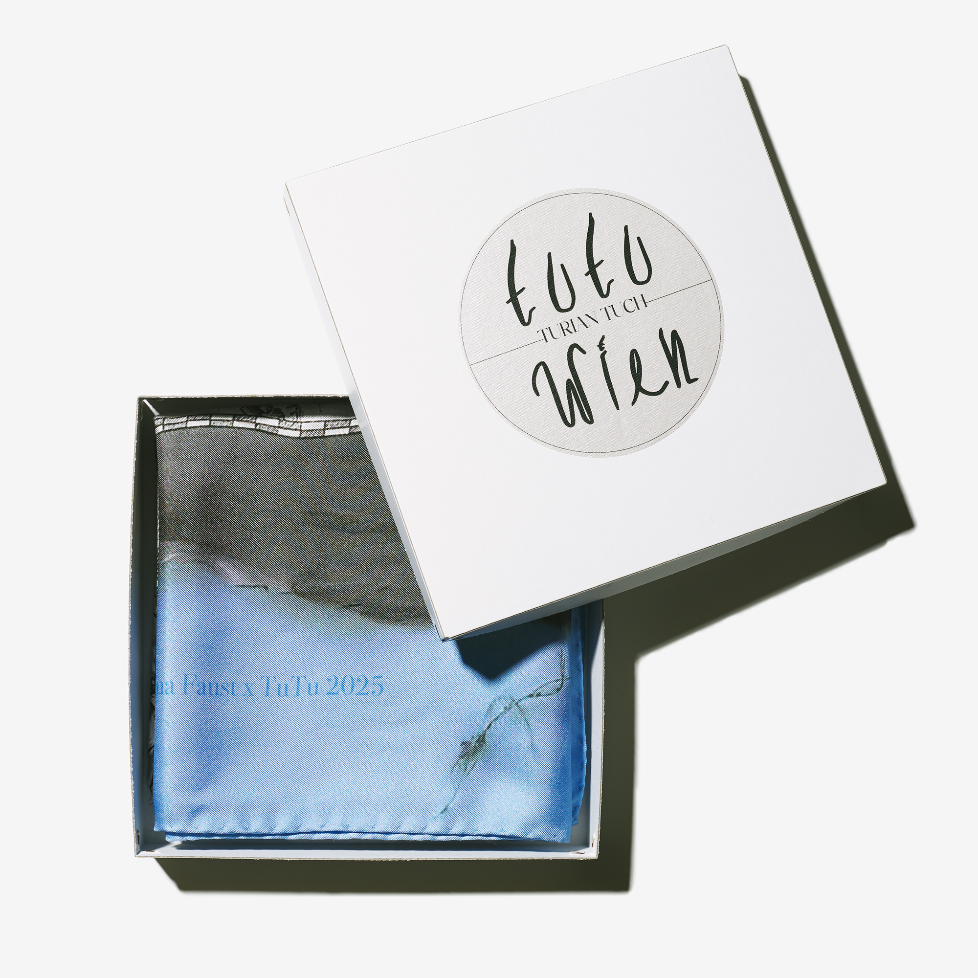 Das Foulard für TuTu.Wien ist ein Doppel-Porträt. Meine Mutter hatte dieses Tuch in den 1960er Jahren erworben, sie kleidete sich nur in Grau und Schwarz, hatte einen außerordentlichen Geschmack und war immer ihrer Zeit voraus. Dieses Tuch repräsentiert nicht nur ihren exquisiten Stil, sondern auch zwei Zeiten: meine Kindheit und die Phase, in der ich begann, das Tuch zu tragen. Es hat mich bis zu seinem Zerfall begleitet. Irgendwann kam der Punkt, an dem ich entschied, es im Kasten liegen zu lassen, bevor es völlig auseinanderfiel. Eines Tages, dachte ich, wird es noch eine Verwendung finden. Ohne Zweifel ist die schönste und beste Phase diese hier gezeigte, mit all der Fülle des Erlebten. Als nächsten Schritt habe ich ihm für dieses Projekt eine Hintergrundfarbe gegeben, Blau, als Farbe der Vernunft und der Unendlichkeit.