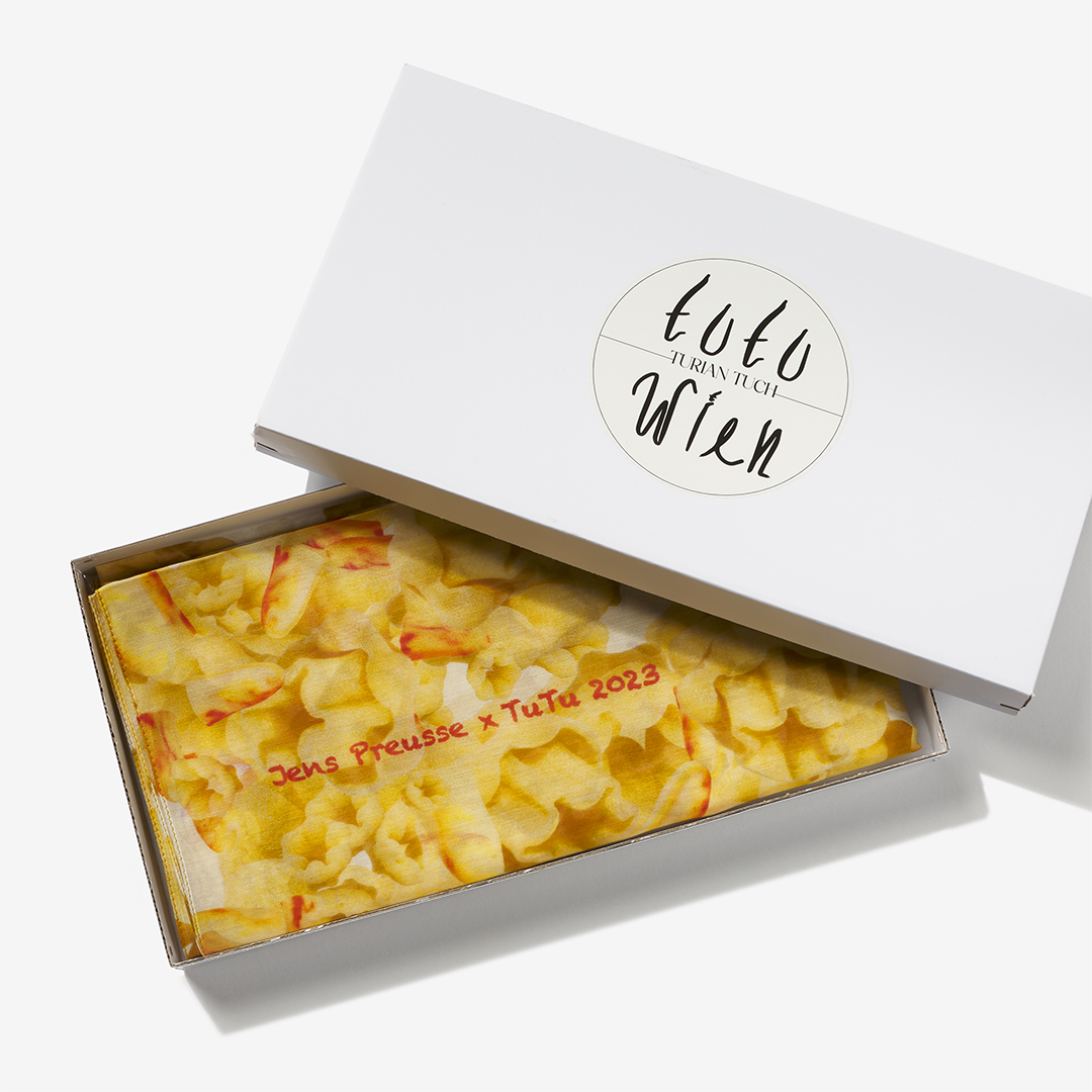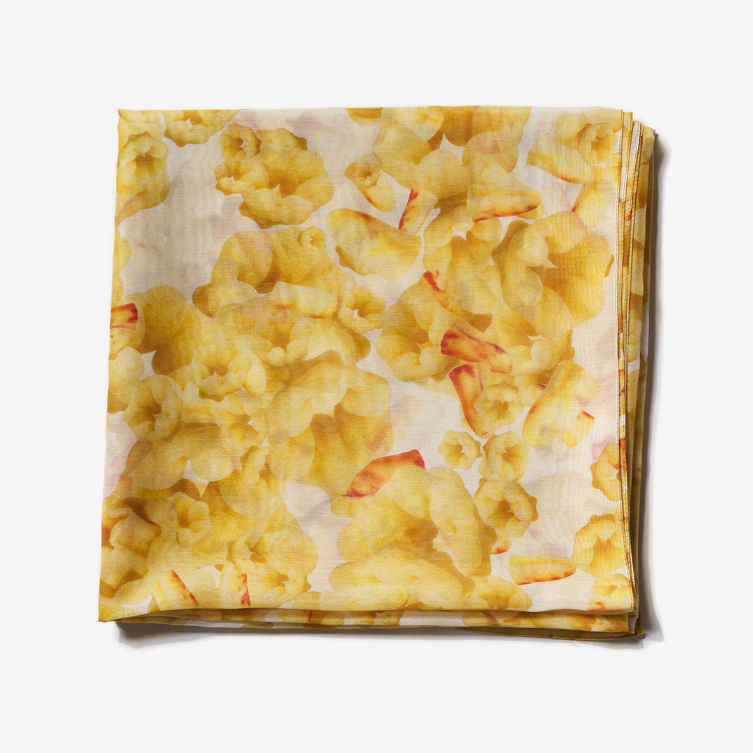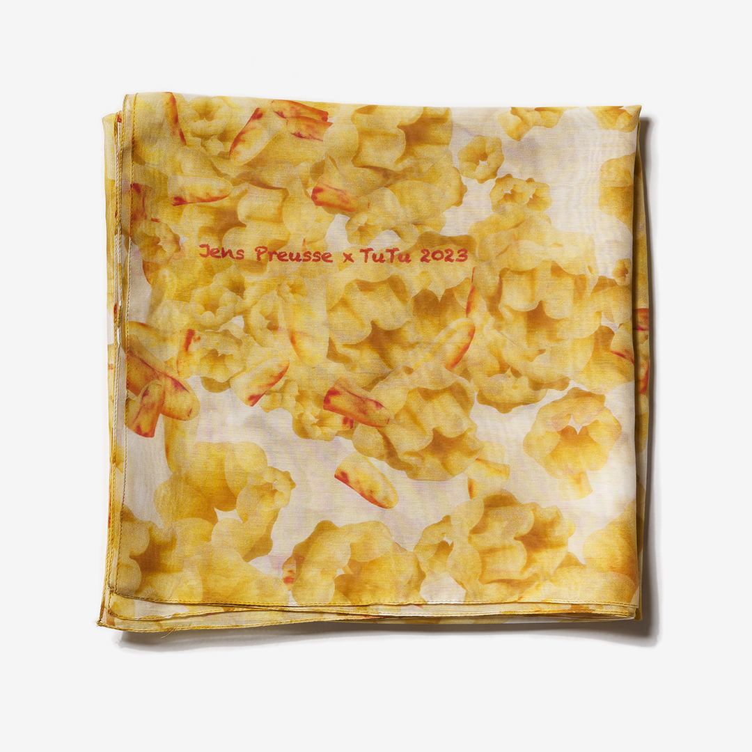 Ich wollte ein sonnig-strahlendes Tuch gestalten. Dabei kamen mir die Fiori-Nudeln und die Ohrstöpsel in den Sinn, mit denen ich schon länger eine Arbeit realisieren wollte. Zusammen ergeben sie hier ein stimmiges Bild. JP